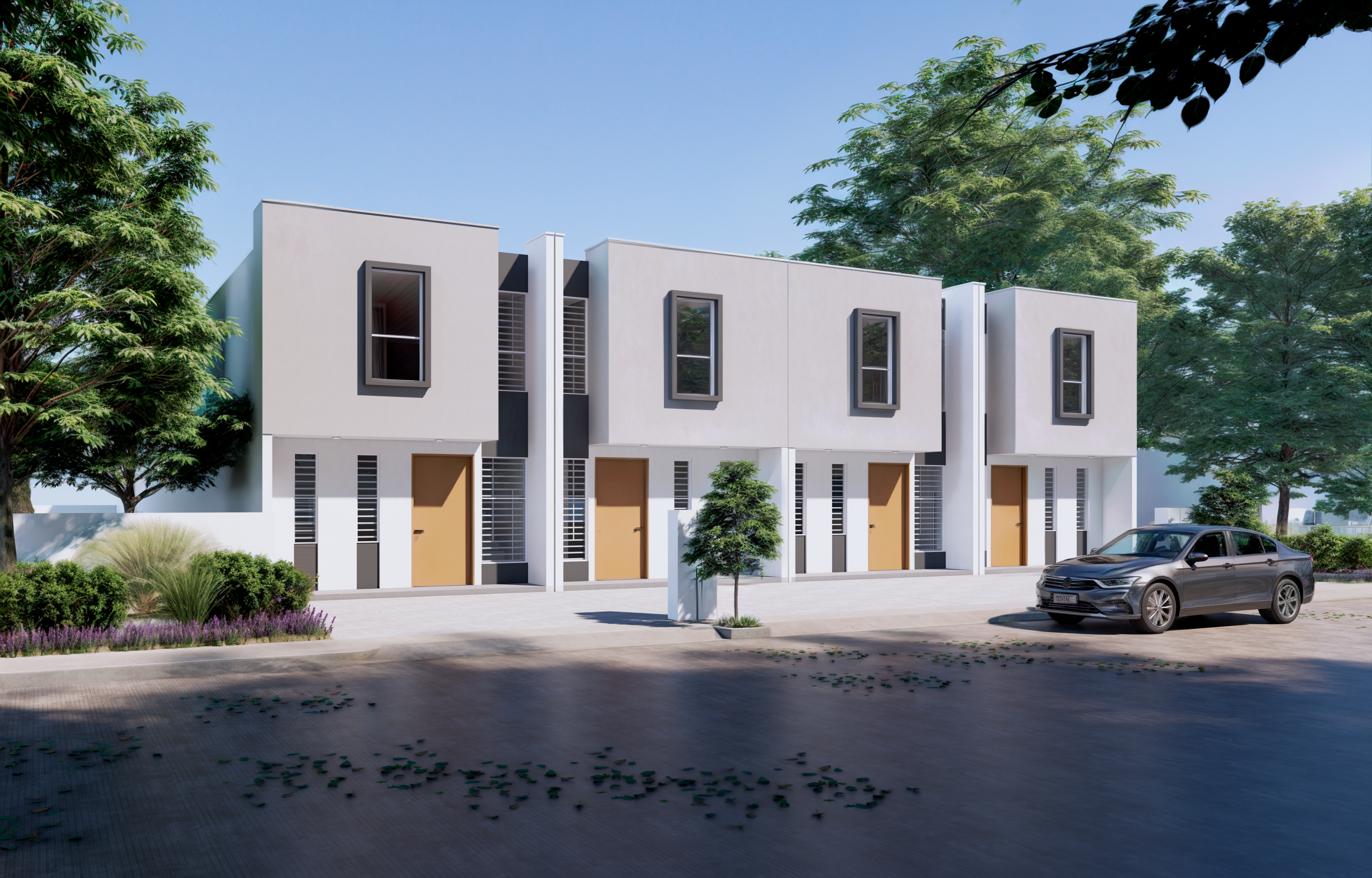 El Modelo 2 cuenta con 113 m² de construcción en un terreno de 5 x 25 m. La distribución en dos plantas incluye: 2 Dormitorios y 1 Baño Completo en Planta Baja, y 1 Dormitorio Principal con Vestidor y Baño Completo en Planta Alta. Además, tiene Living–Comedor–Cocina, Jardín, Cochera para 2 autos y Patio de Servicio.